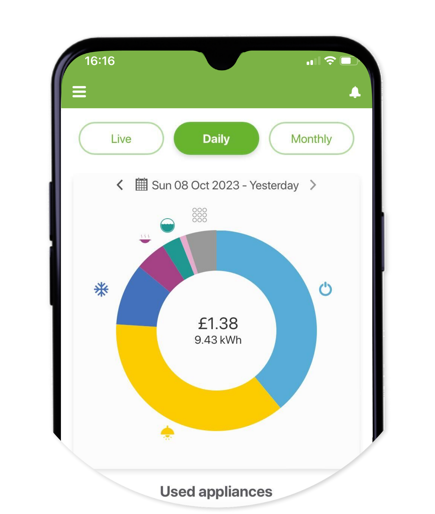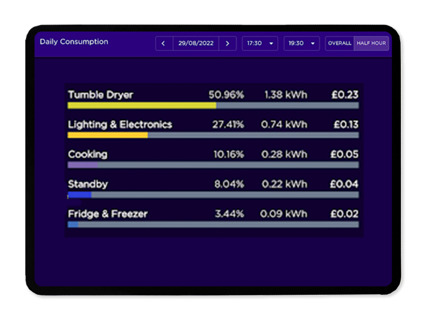 Voltaware’s AI algorithms detect the energy use of your appliances, such as washing machine or fridge & freezer, in real-time and splits them down to pounds and pence.